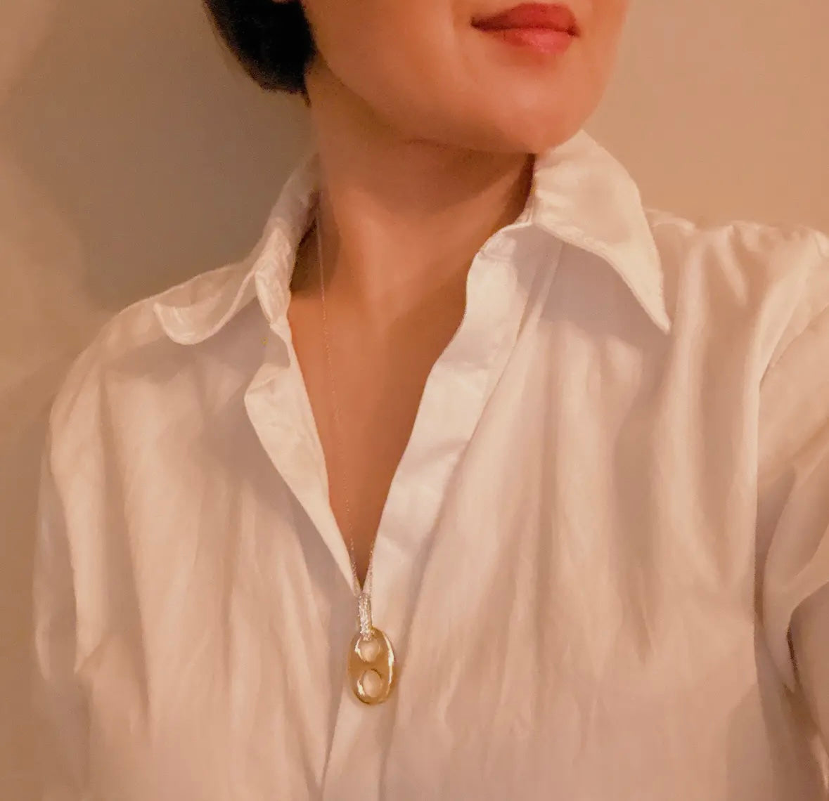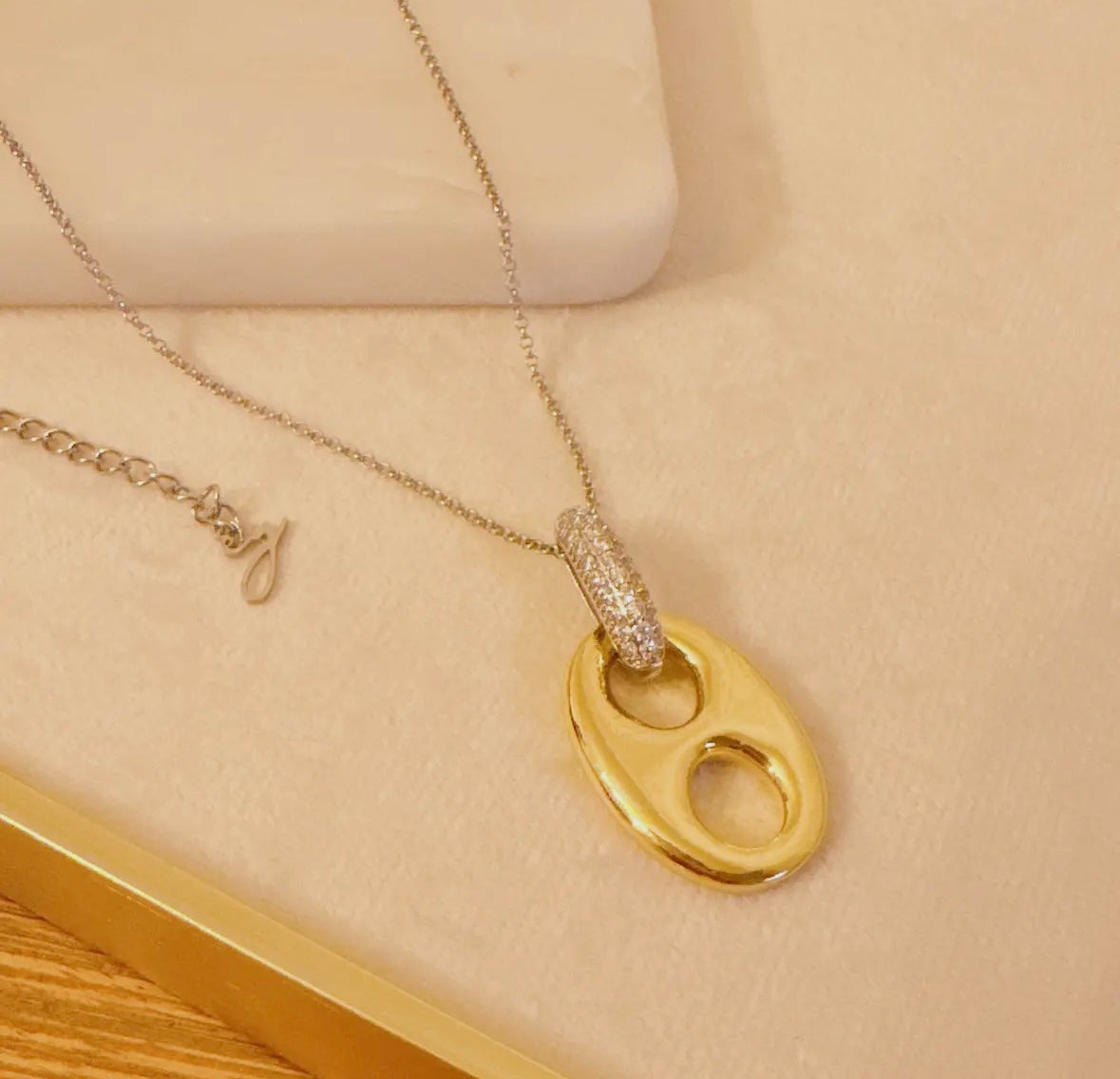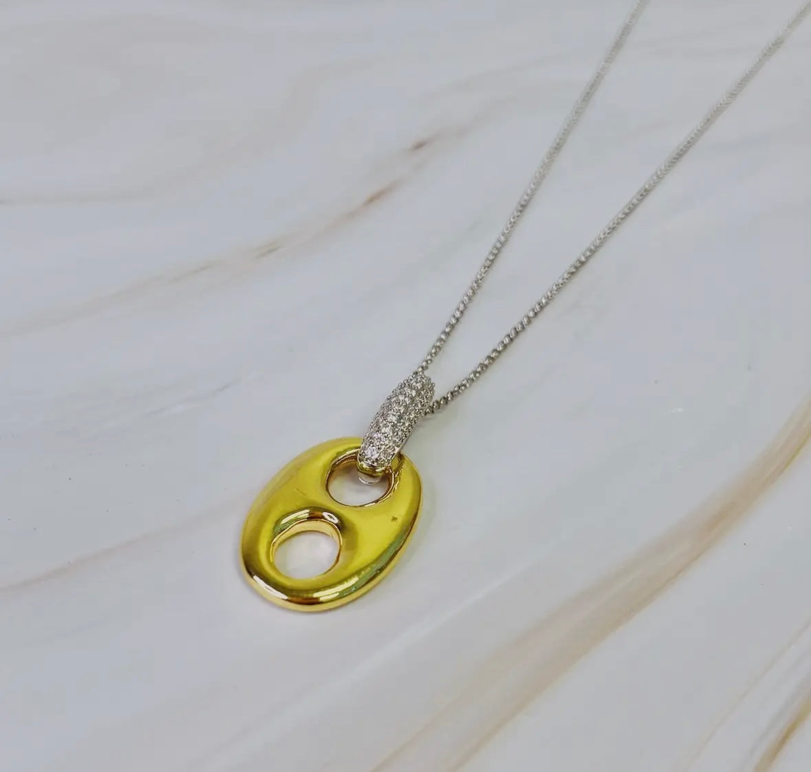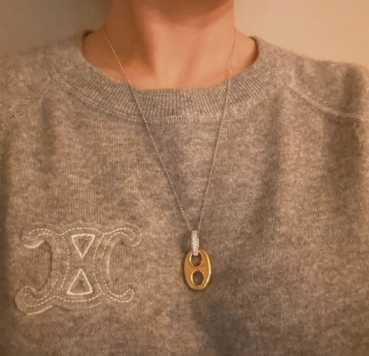love it! Longer chain but not quite pendant length, pave holder, gold horse bit, love the mixed metal. simple yet a statement