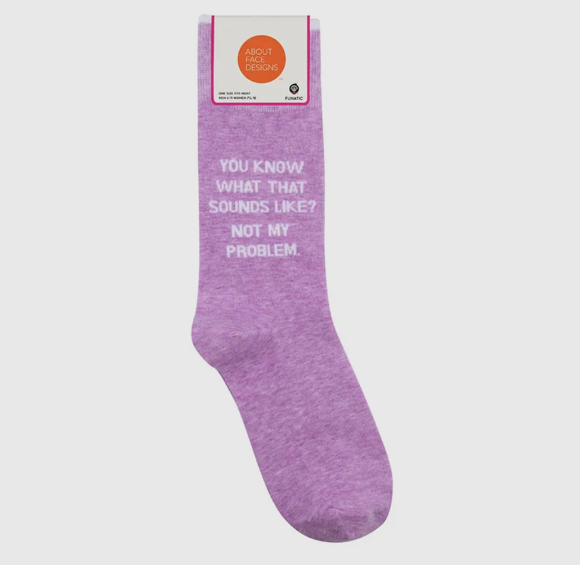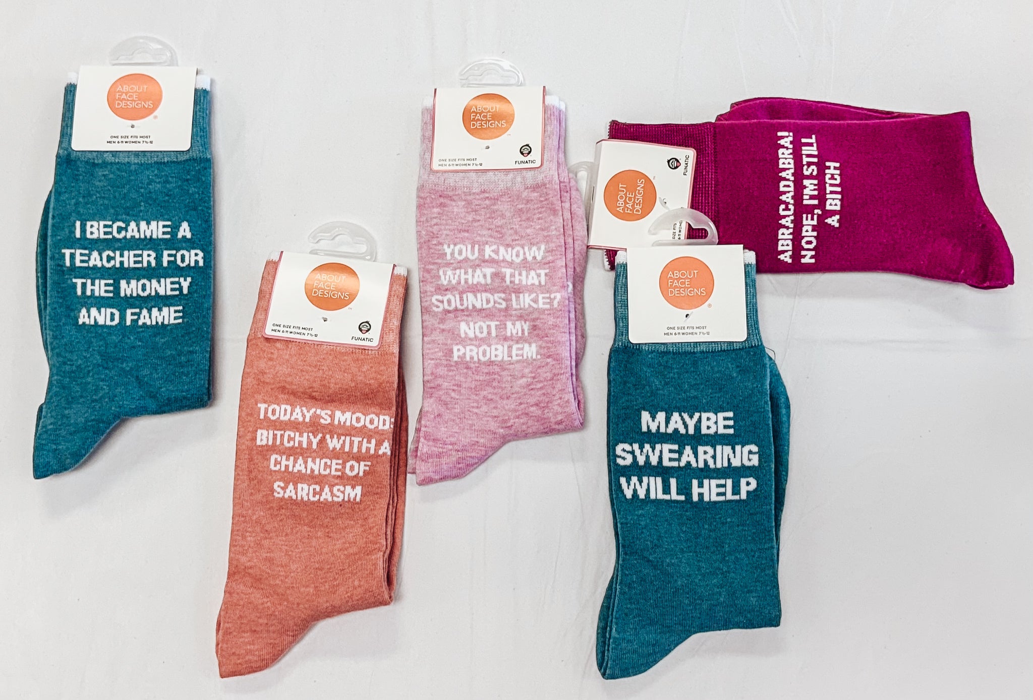 these are great! solid socks with white lettering sewn in, standard trouser sock sizing, one size fits most, cotton blend