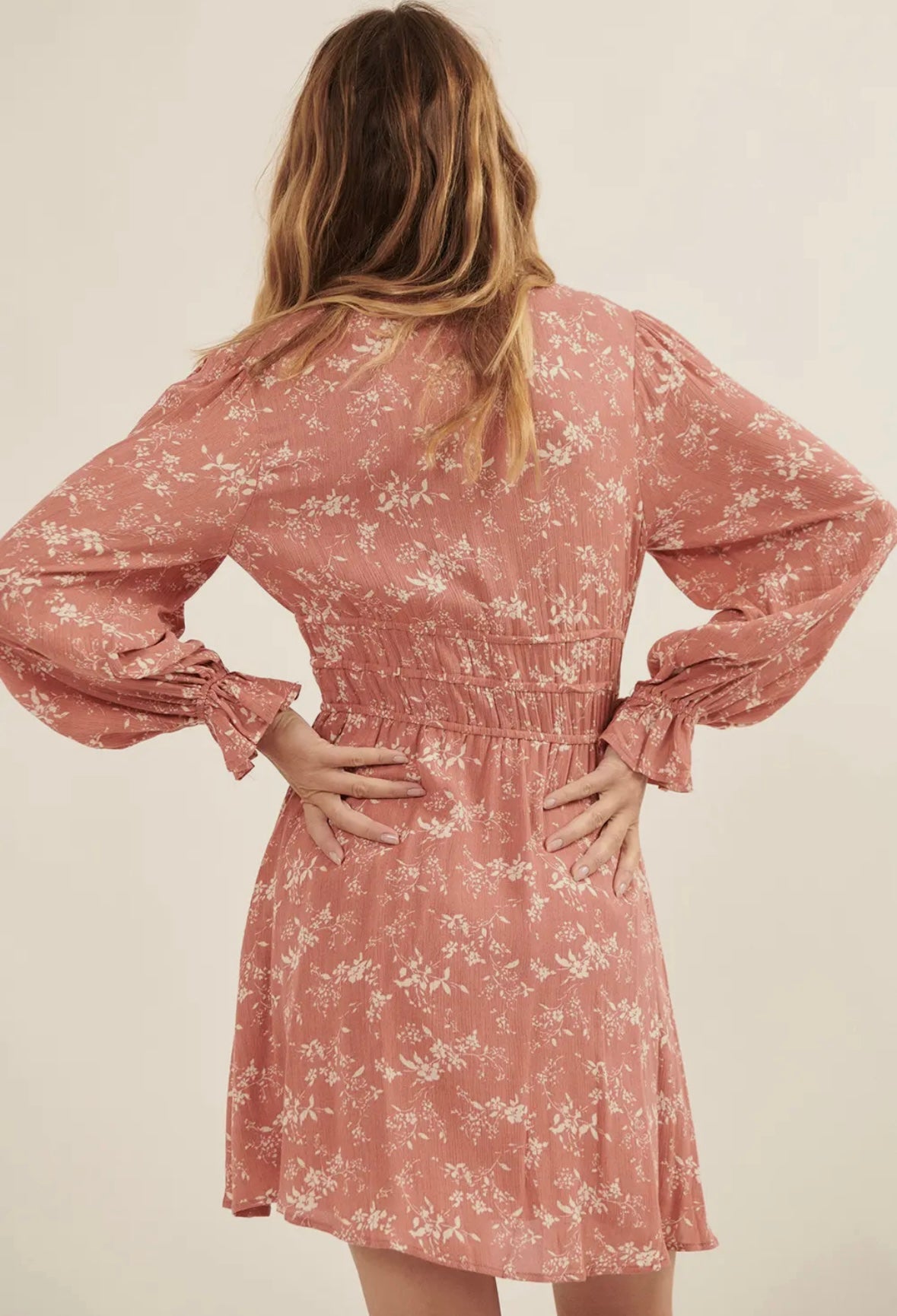 pretty pretty shade of apricot with small floral design throughout, long sleeves, button down, lined, washable, smocked elastic at waist