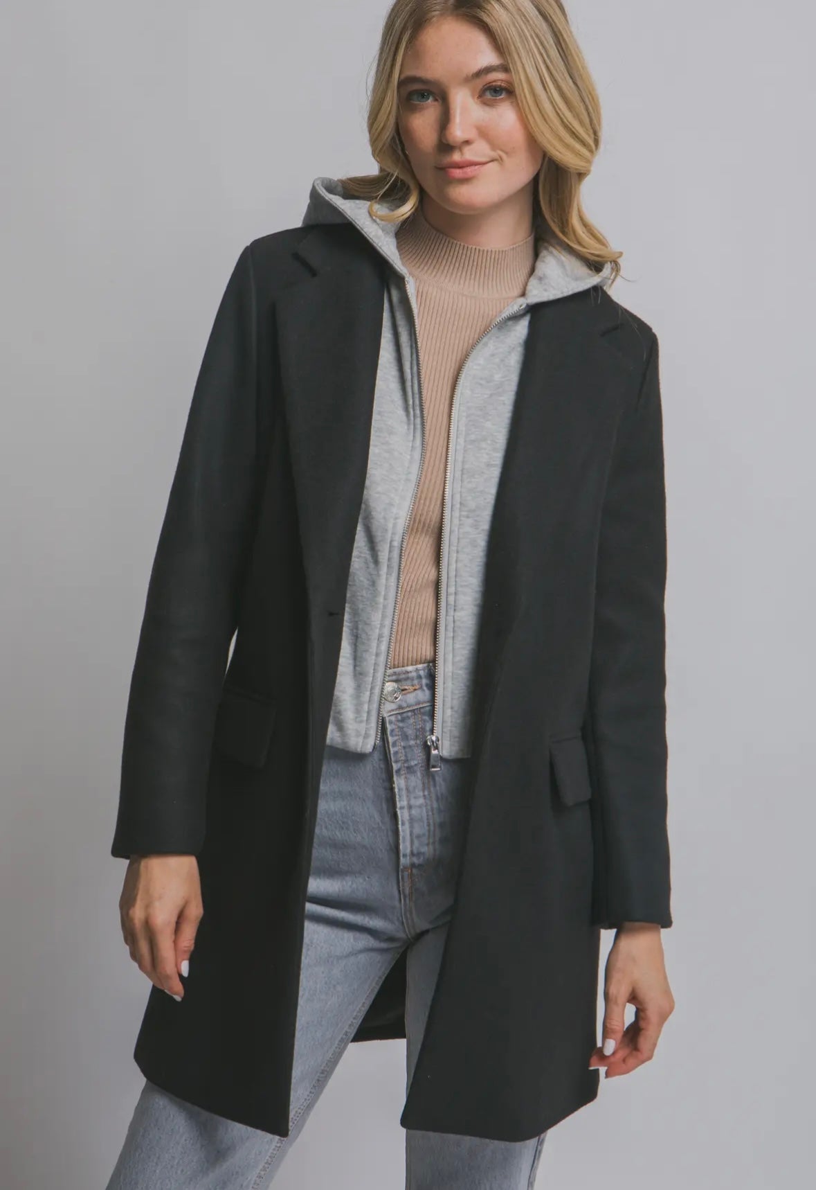 two layer look with one layer, faux zip hoodie oh the inside with one button classic wool jacket, runs true to size