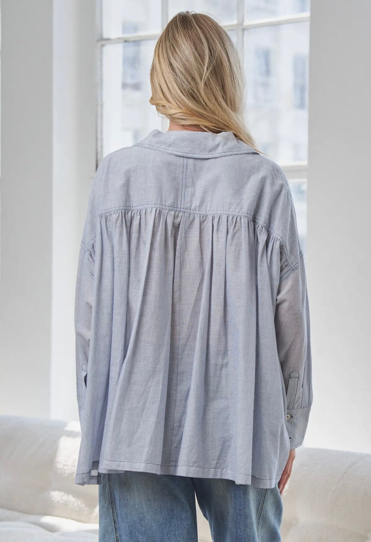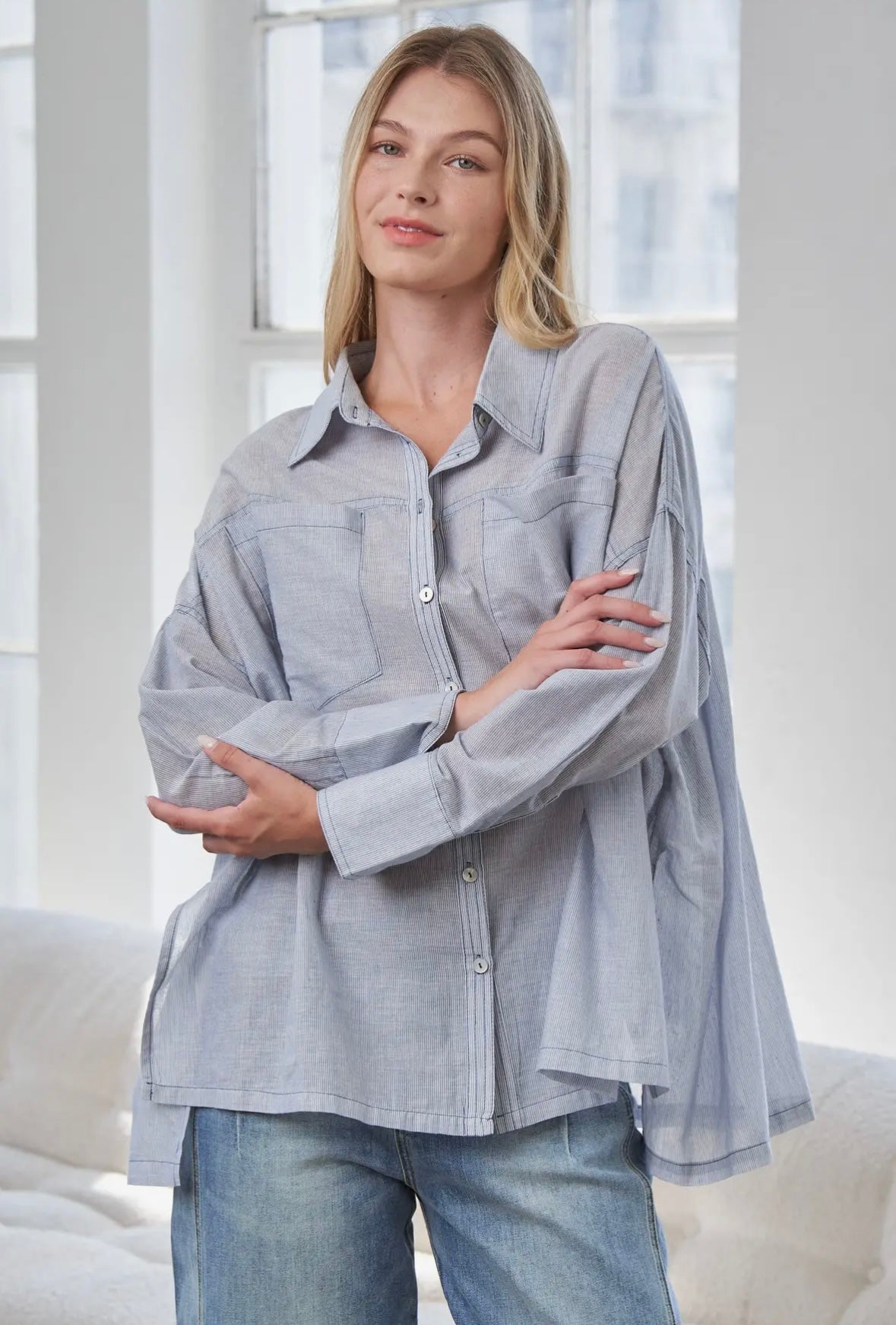 light weight, light blue swing blouse, slightly sheer- wear a tank under, wear it now and later, so cute!