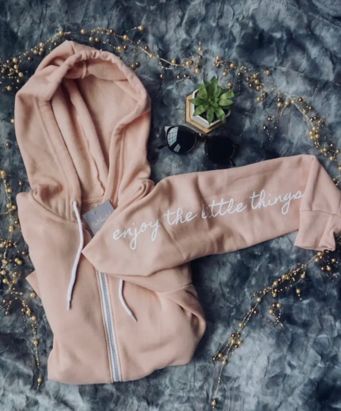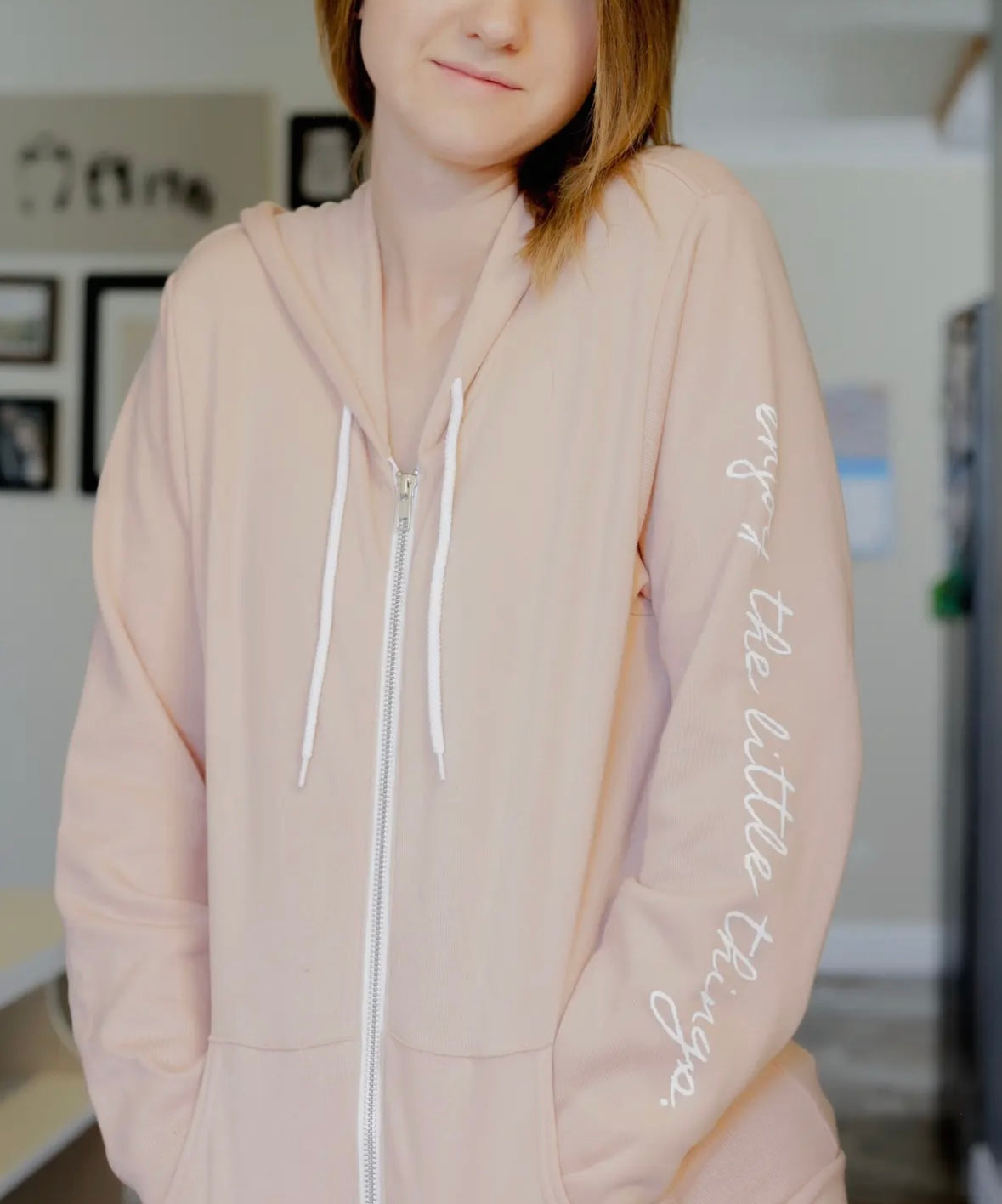 pretty blush hoodie with full front zip, white tie hood, high quality Bella canvas, not super thick but warm