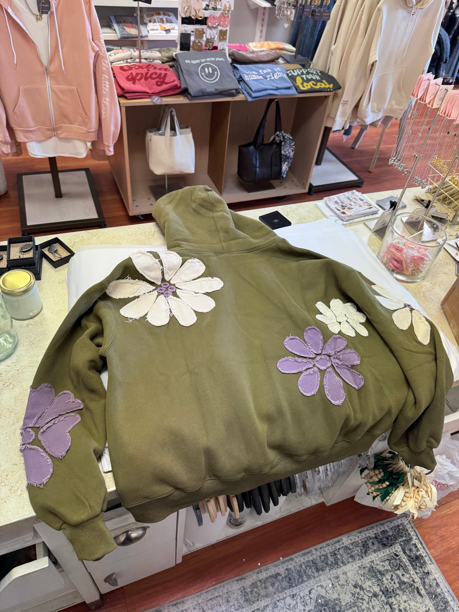 buttery soft olive hoodie with hand sewn floral patch detail, oversized, floral patch colors are cream purple, blue, kangaroo pockets