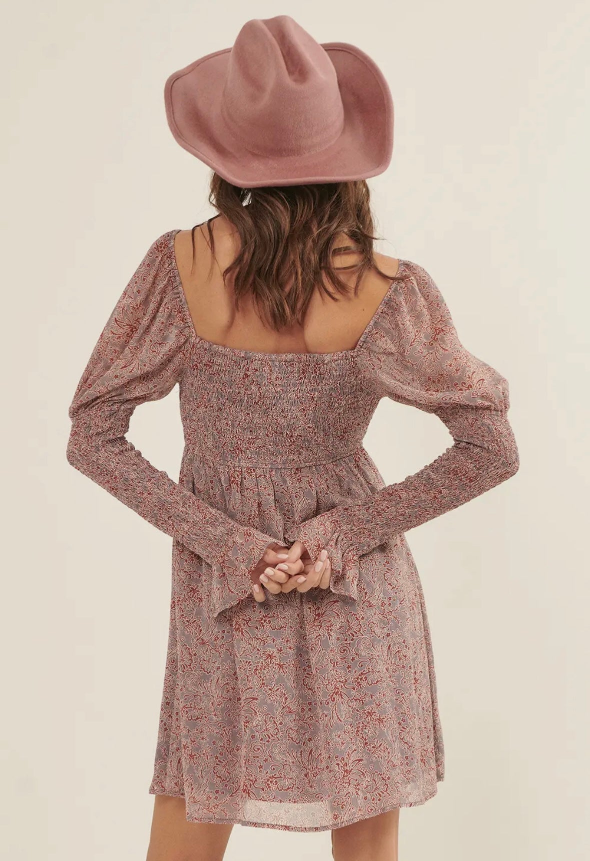 pretty long sleeve dress with poet sleeve, hits at knee or above, lined, washable, pretty lilac blue with coral accent, elastic waist, smocked back