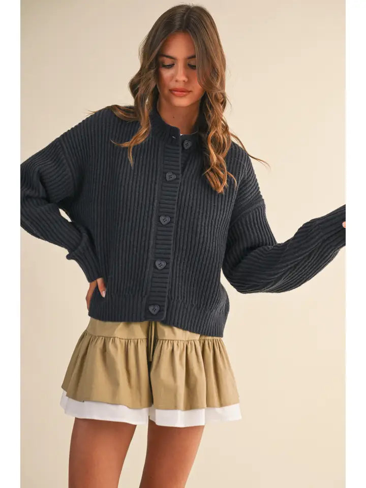 navy shaker cardi with heart buttons in navy and love in script on back, 100 poly