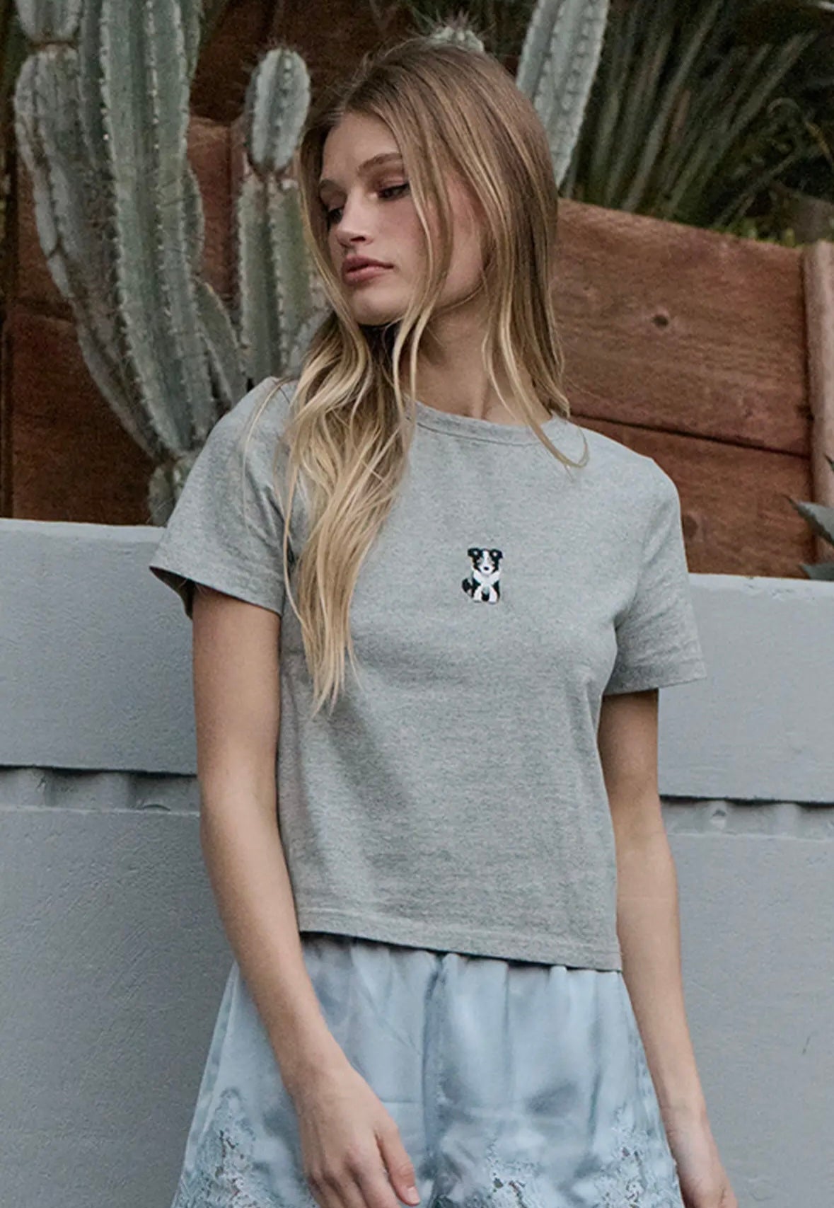 baby tee with dog embroidery, runs small, definitely a baby tee, super cute!