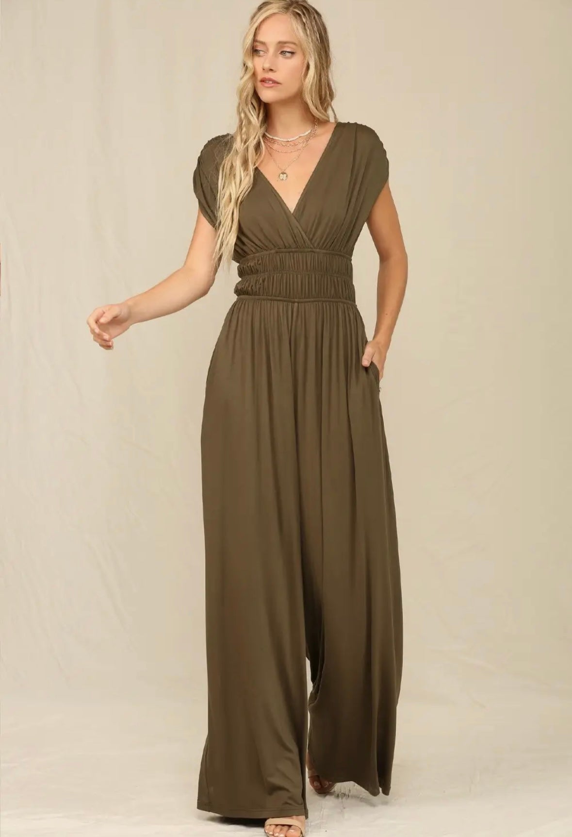 flowy and easy with pockets, pretty shade of olive, washable, stretch waist with smocking, tie back for the cap sleeve v neckline
