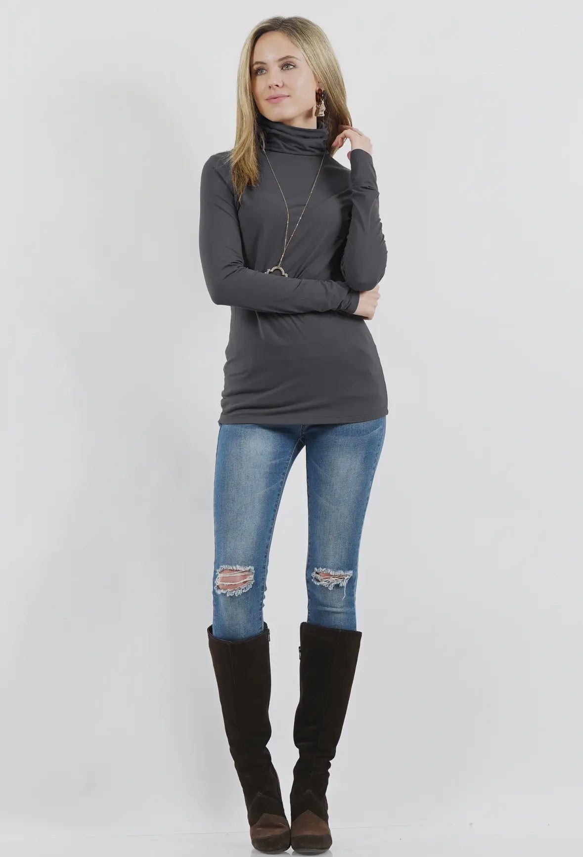 ruched collar turtleneck in super soft blend, VERY fitted, great way to get that extra layer, also perfectly modern with jeans, boots, add a great earring