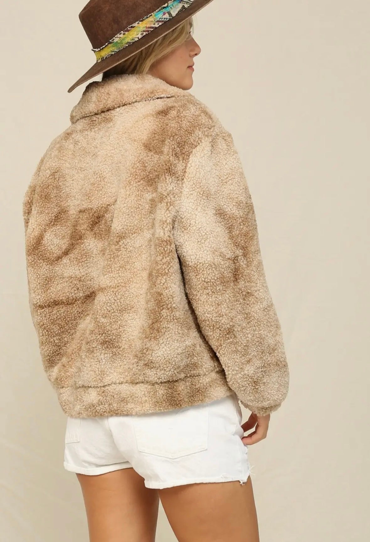 super cute zip jacket, tye dye detail that makes this teddy jacket different from the rest, two front pockets, zip front, stretch waist band, washable, hang to dry