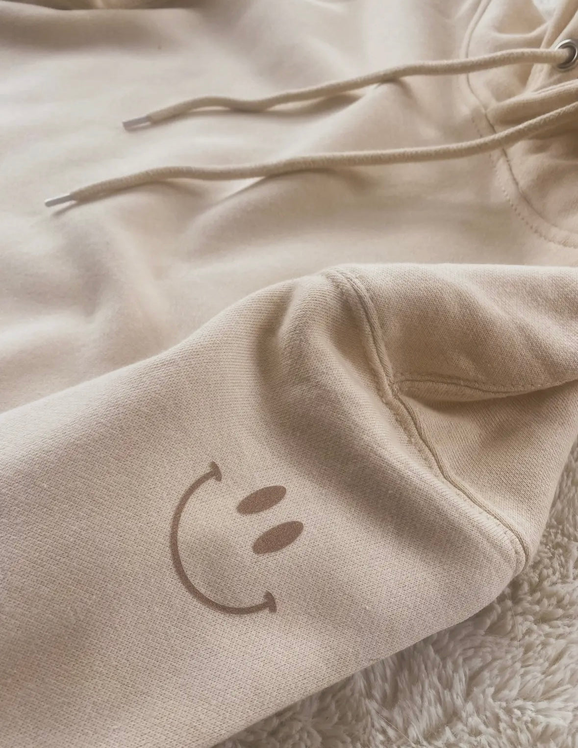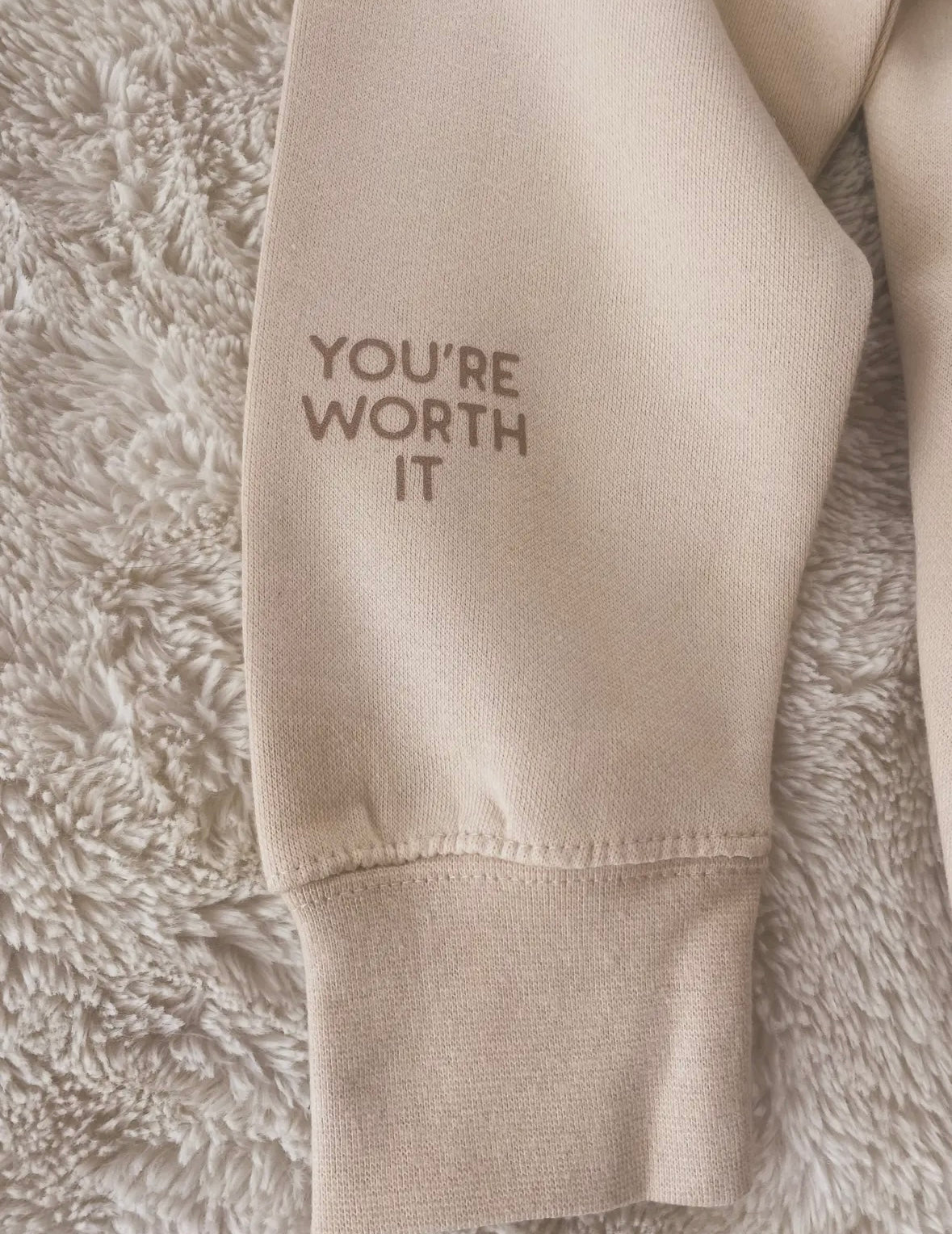 simple cream hoodie with your worth it written on right sleeve, a smiley face on top left shoulder, love it! Oversized fit but not super huge, pull ties at hood, kangaroo pockets